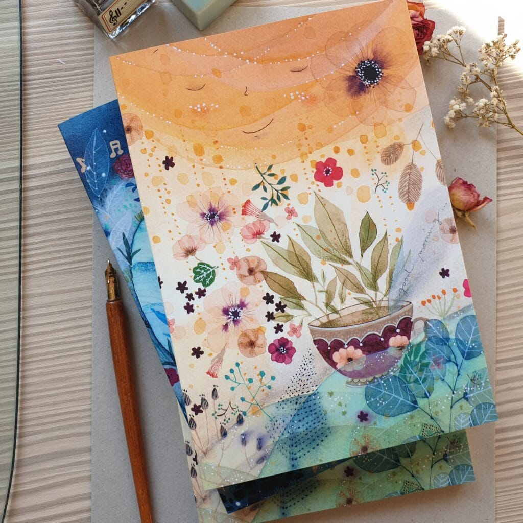 I also created two types of notepads. The larger ones measure 18×15 cm, the smaller 10×10 cm. I chose a floral pattern in warm pink tones. They’ll cheer you up every time you walk into your workspace—like having a vase of fresh flowers on your desk all the time. Each pad also has 100 sheets. Every design was painted by hand.