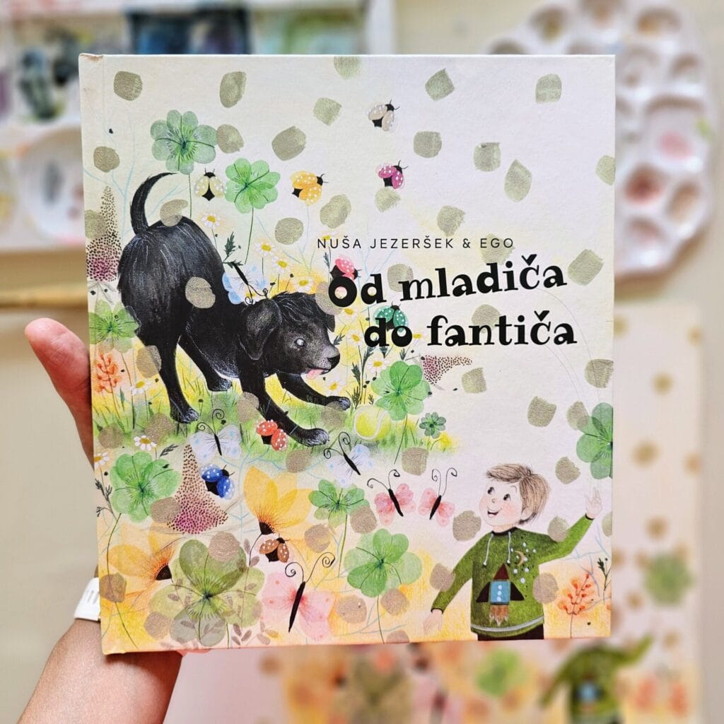 The book began as a gift to her dog Ego, now a dignified gentleman in his senior years. Written by Nuša Jezeršek, it features charming interior illustrations contributed by pupils from primary schools across Slovenia—including my eldest, Svit—gathered into a lovely bouquet by Darja Malarič.