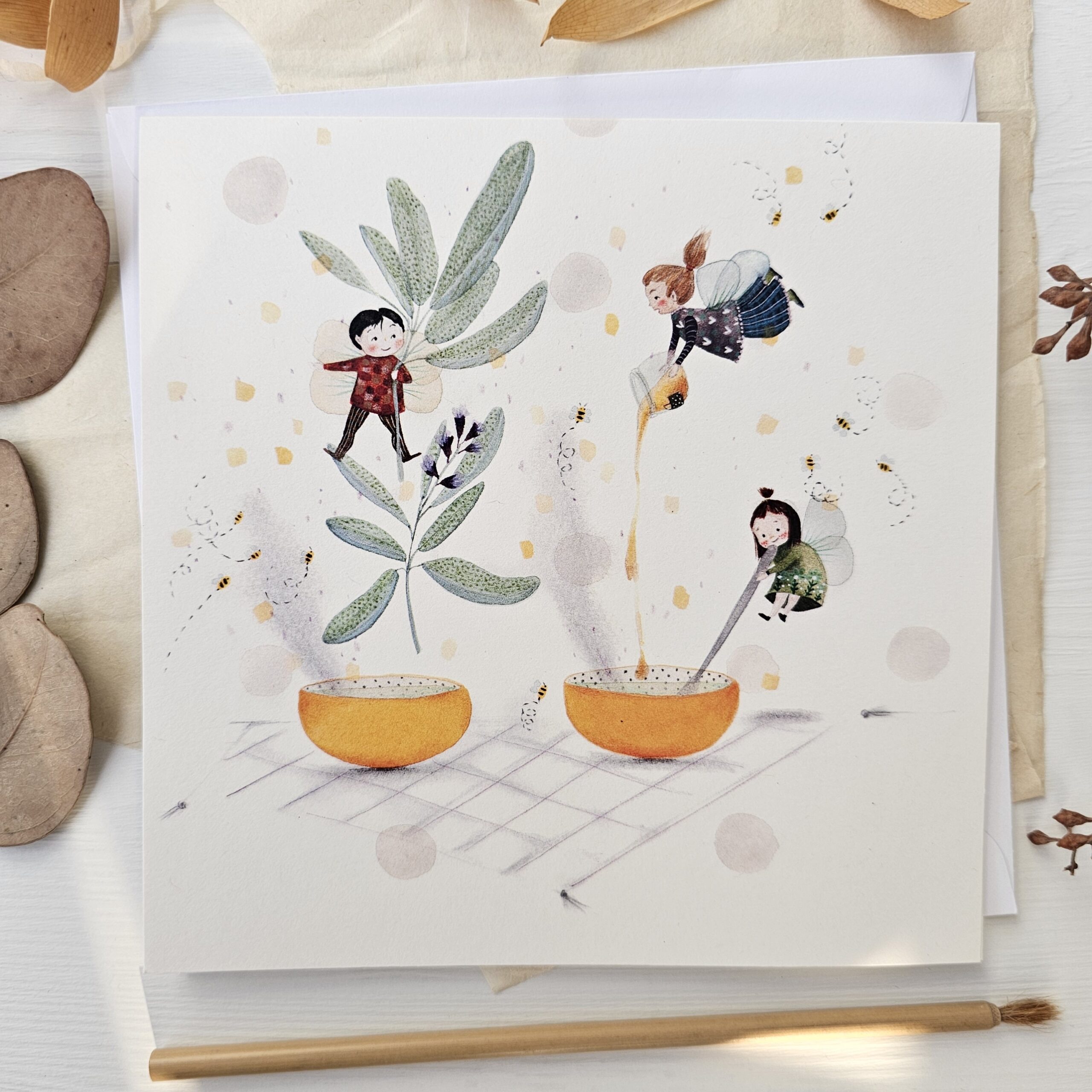 Voščilnica ”Žajbelj in med” – voščilnica, ki diha toplino in navihanost. Priložena kuverta, notranjost prazna za tvoje besede. Velikost 15×15 cm